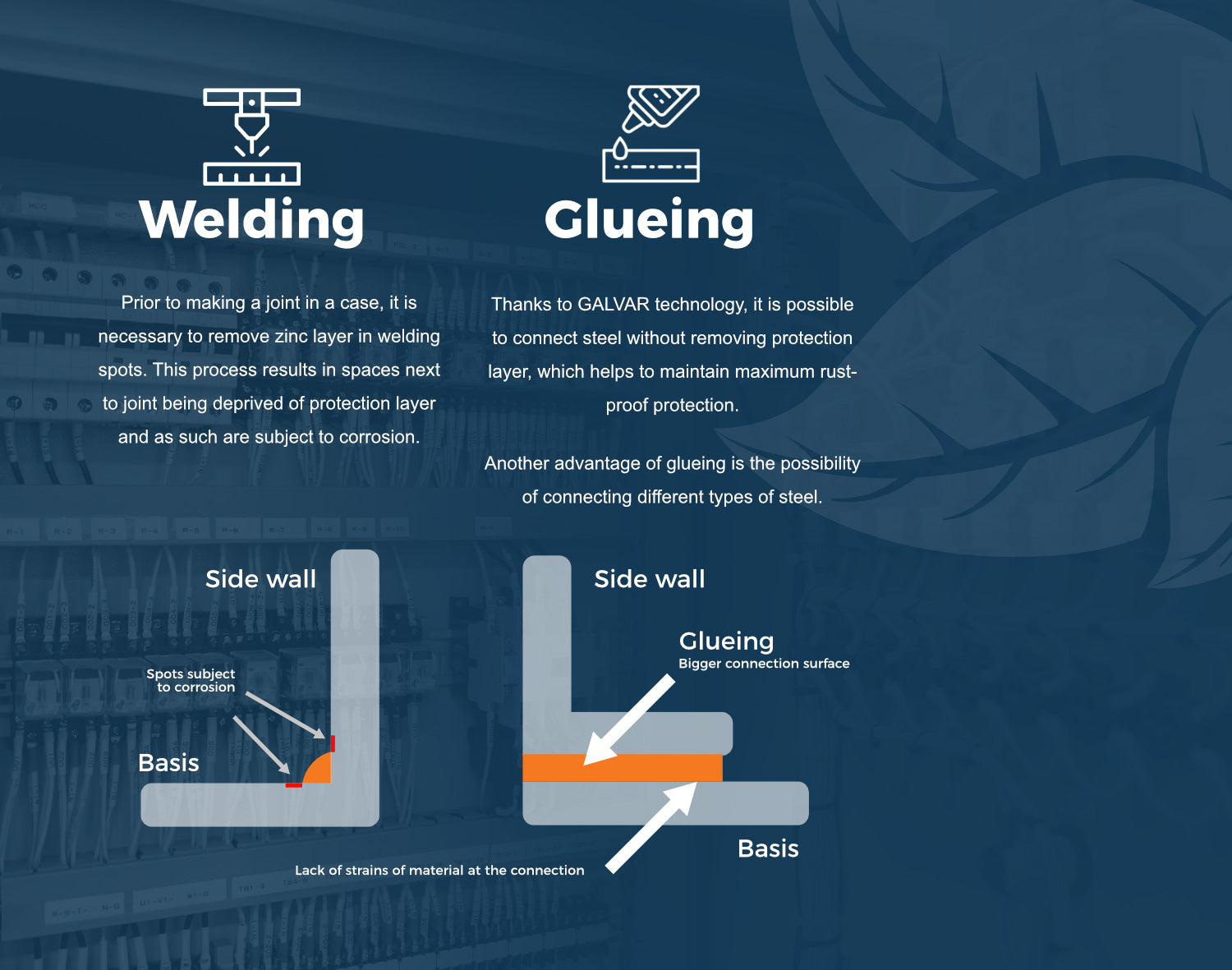 Zinc protection layer remains intact High tightness of connections thanks to glueing Possibility to connect different types of materials No qualified staff needed for assembly process Flat Pack version (flat sheet metal for self-assembly)
